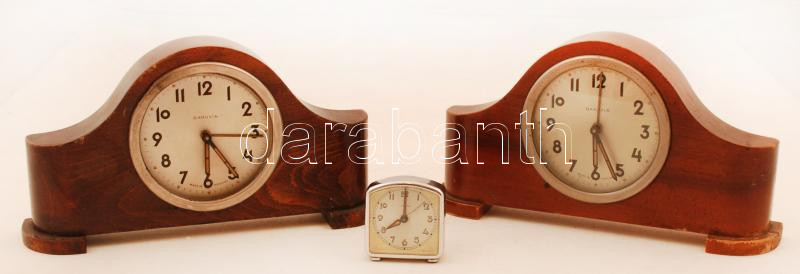 Asztali óra tétel: 2 db fa asztali óra, nem működnek, az egyikben a szerkezet jó, de a mutató nem jár és hiányzik az üveglapja + 1 db kisméretű Junghans márkájú fém asztali óra, nem működik