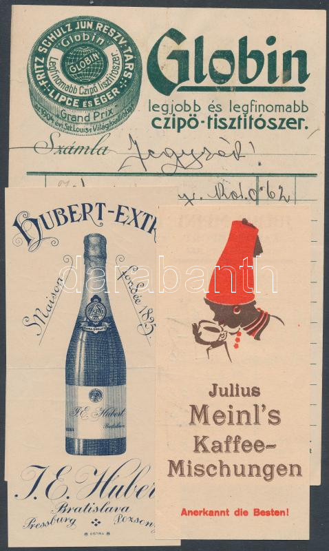 Beschreibung: 2 db számolócédula (Julius Meinl, Hubert-Extra), 1 db díszes fejléces számla (Globin legjobb és legfinomabb cipőtisztítószer)