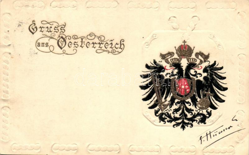 Gruss aus Österreich, osztrák címer / Austrian coat of arms Emb. (wet ... https://www.darabanth.com/de/227-Fernauktion/227.0/Ansichtskarten/Flaggen-Wappen~600113/Gruss-aus-Osterreich-osztrak-cimer-Austrian-coat-of-arms-Emb-wet-damage~II1007452