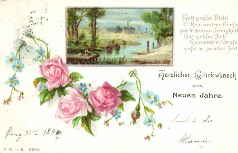 1898 New Year, landscape, boats, flowers litho https://www.darabanth.com/de/227-Fernauktion/227.0/Ansichtskarten/GruC39Fkarte~600107/1898-New-Year-landscape-boats-flowers-litho~II1007193