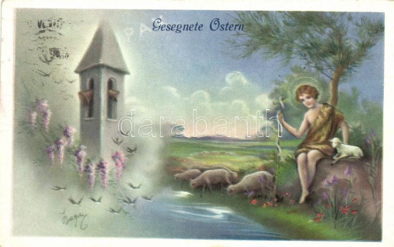 Easter, bell tower, shepherd with lambs, Degami 1548. https://www.darabanth.com/de/227-Fernauktion/227.0/Ansichtskarten/GruC39Fkarte~600107/Easter-bell-tower-shepherd-with-lambs-Degami-1548~II1007118