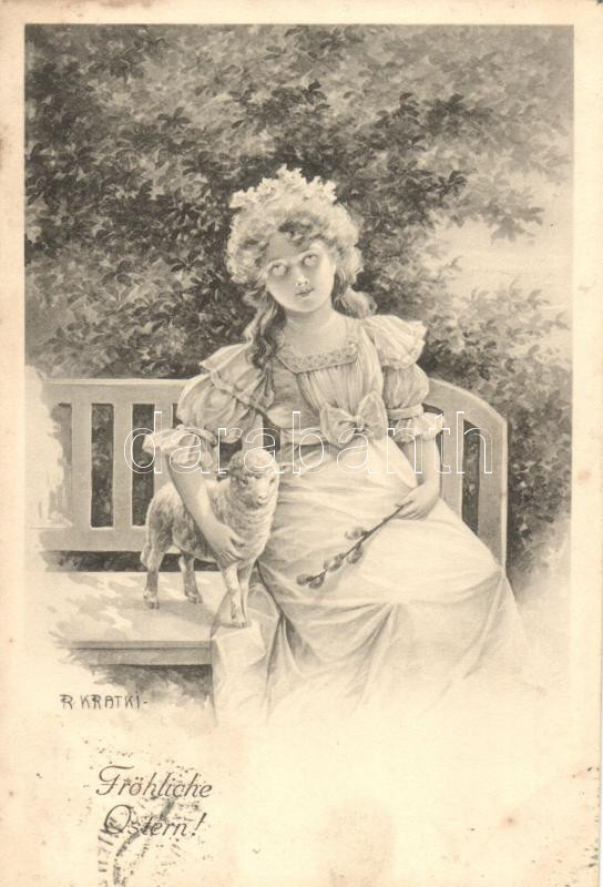 Easter, lady with lamb, Déposé Serie 217. s: R. Kratki https://www.darabanth.com/de/227-Fernauktion/227.0/Ansichtskarten/GruC39Fkarte~600107/Easter-lady-with-lamb-Depose-Serie-217-s-R-Kratki~II1007050