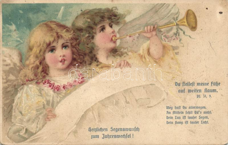 New Year, angels, trumpet litho https://www.darabanth.com/de/227-Fernauktion/227.0/Ansichtskarten/GruC39Fkarte~600107/New-Year-angels-trumpet-litho~II1007299