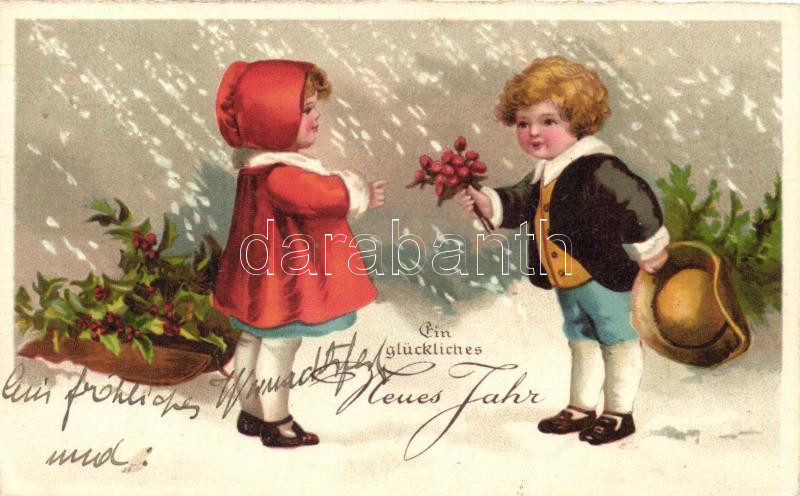 New Year, children couple, snowing litho (EK) https://www.darabanth.com/de/227-Fernauktion/227.0/Ansichtskarten/GruC39Fkarte~600107/New-Year-children-couple-snowing-litho-EK~II1007292