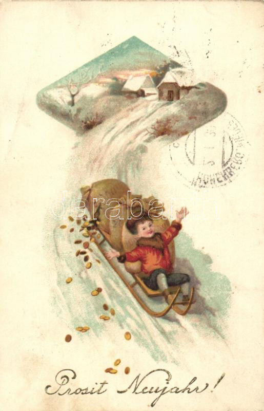 New Year, sledging child, money bags, B.N.K. 3334. litho (EB) https://www.darabanth.com/de/227-Fernauktion/227.0/Ansichtskarten/GruC39Fkarte~600107/New-Year-sledging-child-money-bags-BNK-3334-litho-EB~II1007164