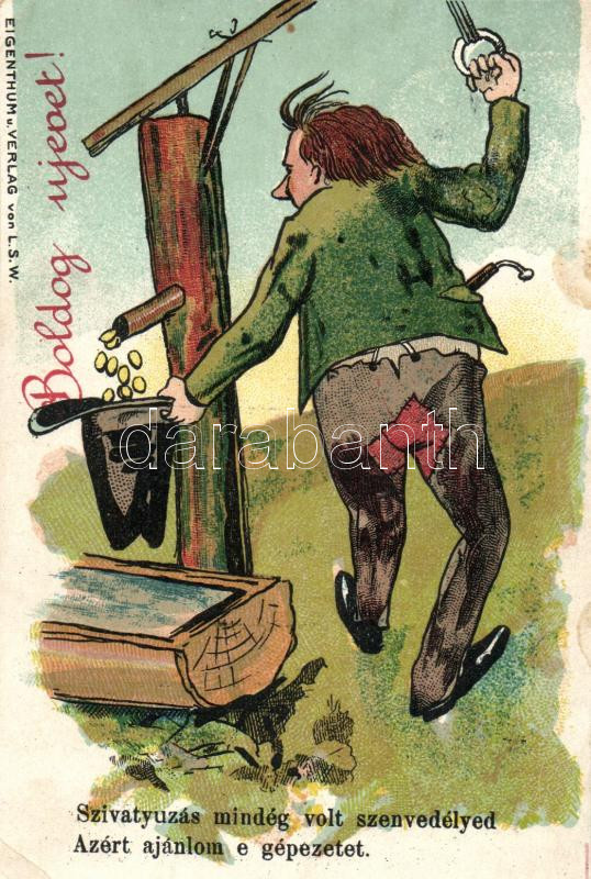 Beschreibung: Szivatyuzás mindég volt szenvedélyed, azért ajánlom e gépezetet / New Year, money well, humour, L.S.W. litho (EK)