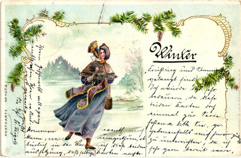Beschreibung: Winter greeting card, ice skating lady, Kunstanstalt Wilhelm Boehme Postkarte No. 1073. litho