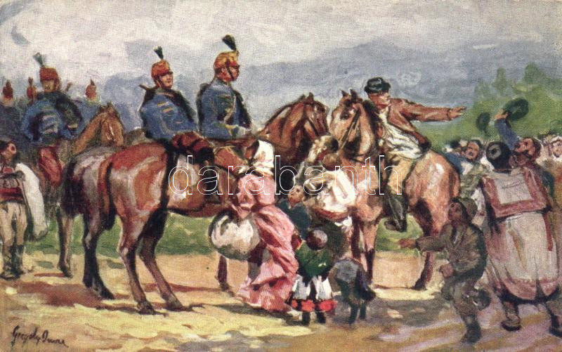 Beschreibung: Az ellenségtől felmentett város népe üdvözli a bevonuló huszárokat / Hussars, Military WWI propaganda, Nr. 687. s: Gergely