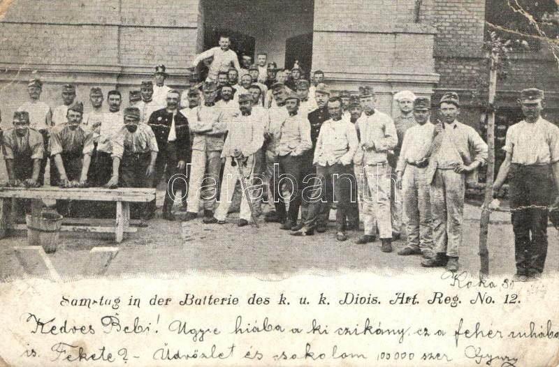 Samstag in der Batterie des k.u.k. Divis Art. Reg. No. 12. / K.u.k. Mi... https://www.darabanth.com/de/227-Fernauktion/227.0/Ansichtskarten/Militaria~600073/Samstag-in-der-Batterie-des-kuk-Divis-Art-Reg-No-12-Kuk-Military-b~II1004525