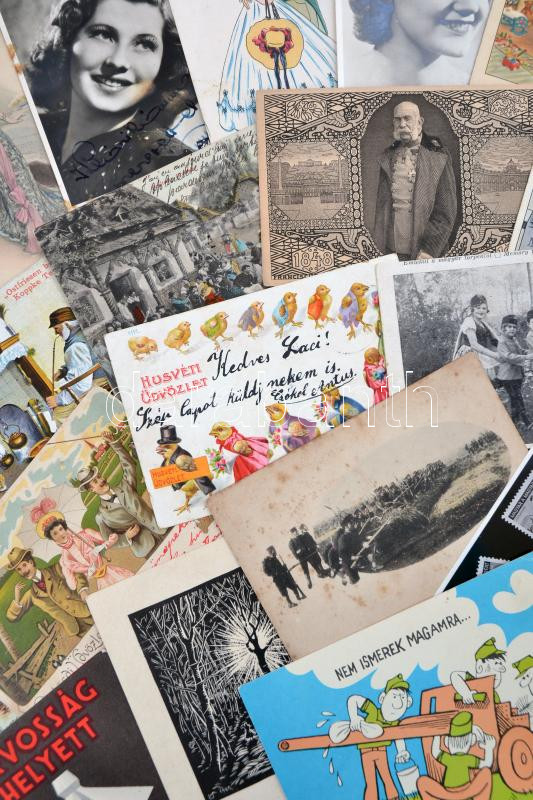 41 db VEGYES motívumlap pár lithoval; humoros katonai grafikai lapok, üdvözlő, színész, uralkodó, gyerek / 41 mixed motive cards with some lithos; humorous military graphic, greeting, actors, royalty, children