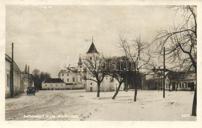 Seibersdorf, Market place, church, automobile, winter https://www.darabanth.com/de/227-Fernauktion/227.0/Ansichtskarten/Osterreich~600053/Seibersdorf-Market-place-church-automobile-winter~II1004486