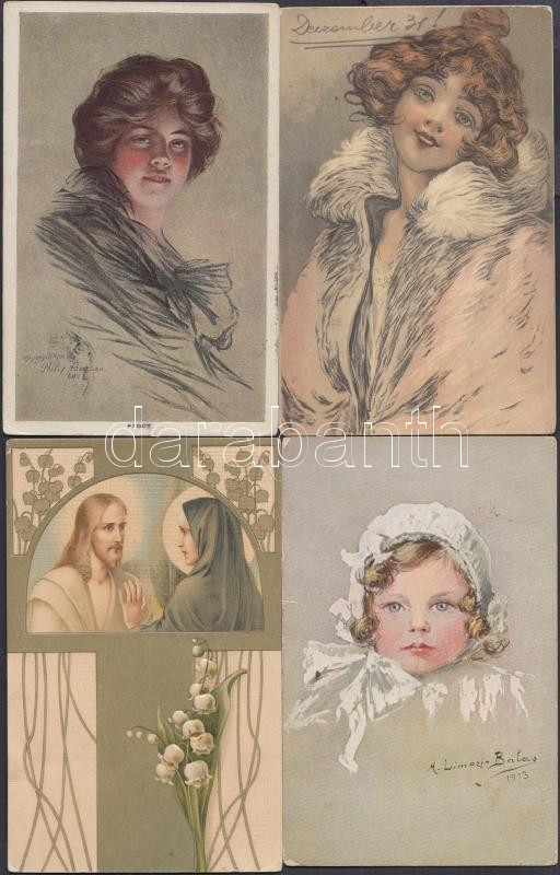 15 db RÉGI motívum lap, művészlapok, hölgy motívumú lapok és vallási témájú lapok, benne egy dombornyomott, litho lap / 15 old motive cards, artist, lady, religion, including 1 embossed, litho postcard