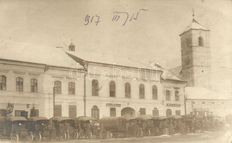 1917 Ditró, Fő utca télen, templom, katonai autóegység, Húsfogyasztási Szövetkezet, Melik és Lukáts üzlete, Ifj. Száva István üzlete / main street, winter, church, soldiers, military cars, shops, photo