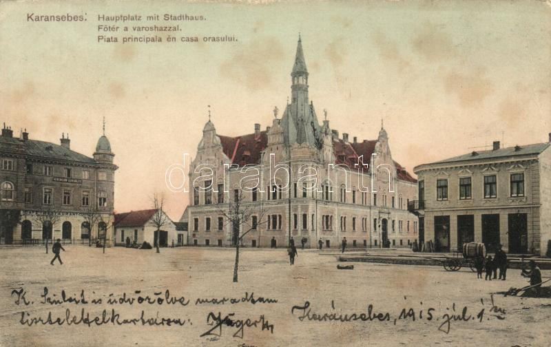 Beschreibung: Karánsebes, Fő tér, Városháza, Központi kávézó / main square, town hall, cafe (kis szakadás / small tear)