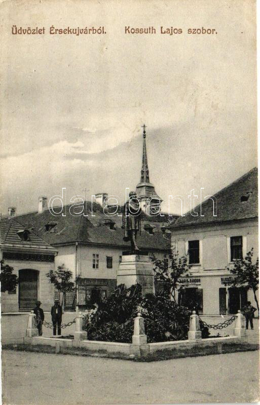 Beschreibung: Érsekújvár, Kossuth Lajos szobor, Haris Sándor, Banyár Miklós és Friedliebic üzlete, kiadja Adler József / statue, shops (EK)