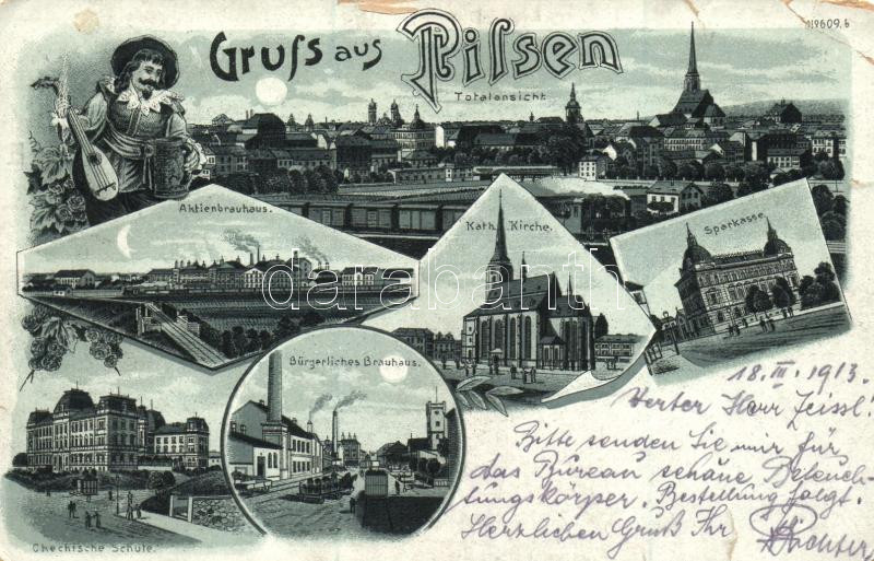 Beschreibung: Plzen, Pilsen; Aktienbrauhaus, Sparkasse, Bürgliches Brauhaus, Chechische Schule / brewery, bank, school, man with beer and mandolin litho (b)