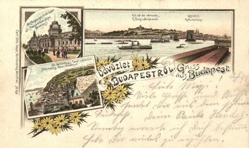 1898 Budapest, Királyi vár és várbazár, Lánchíd, Margitsziget fürdőépület, Gellérthegy, Tabán, Carl Otto Hayd, No. 390. Art Nouveau, floral, litho (Rb)