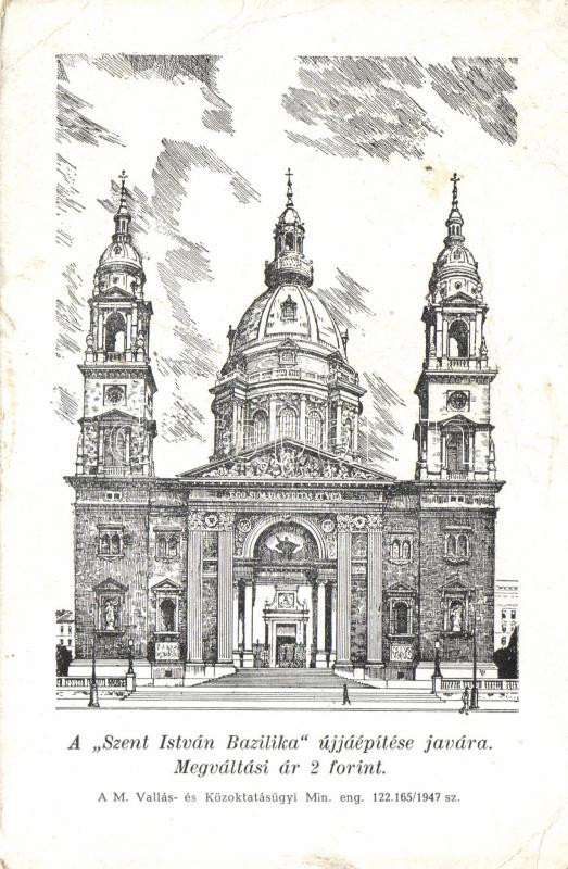 Budapest V. Szent István Bazilika, újjáépítési segélylap (EB) https://www.darabanth.com/de/227-Fernauktion/227.0/Ansichtskarten/Ungarn~400006/Budapest-V-Szent-Istvan-Bazilika-ujjaepitesi-segelylap-EB~II1011956