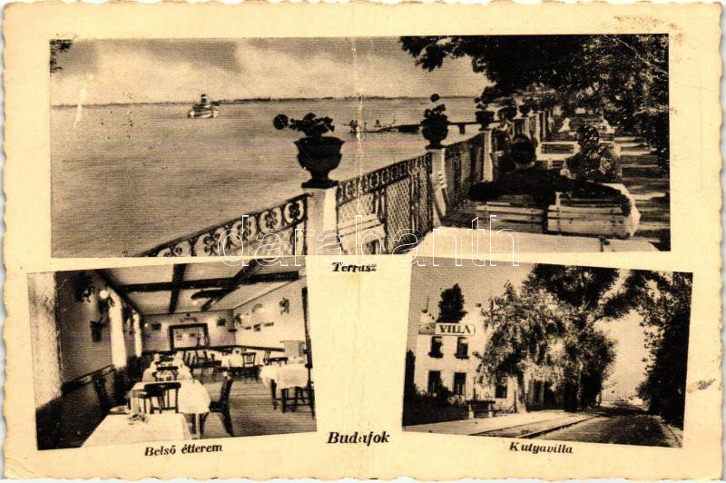 Beschreibung: Budapest XXII. Budafok, Kutyavilla, terasz, étterem, hátoldalon térkép (fa)