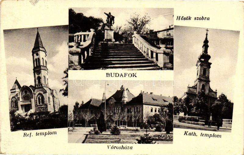 Beschreibung: Budapest XXII. Budafok, Református templom, Hősök szobra, városháza, Katolikus templom (EK)