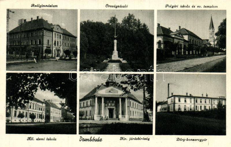 Beschreibung: Dombóvár, Reálgimnázium, országzászló, Evangélikus templom, Járásbíróság, Dőry konzervgyár