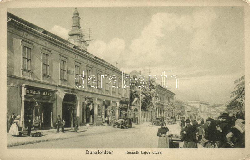 Beschreibung: Dunaföldvár, Kossuth Lajos utca, Házassági Segélyegylet, Somló Manó üzlete és kiadása (kis szakadás / small tear)