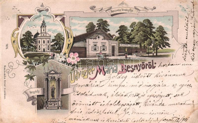 Beschreibung: Máriabesnyő, templom, kegykép, Neszveda vendéglő, Neszveda Antal kiadása, floral, Art Nouveau, litho (kis szakadás / small tear)