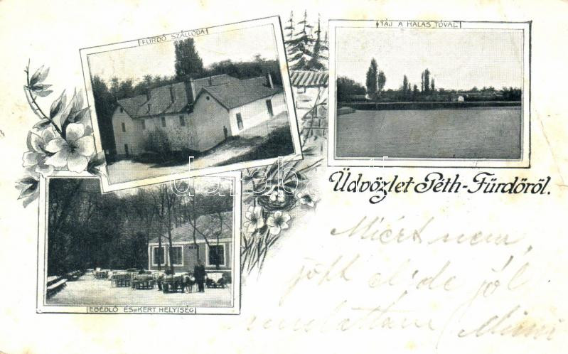 Beschreibung: Pétfürdő, Fürdő szálloda, ebédlő és kerthelyiség, halas tó, floral (kis szakadás / small tear))
