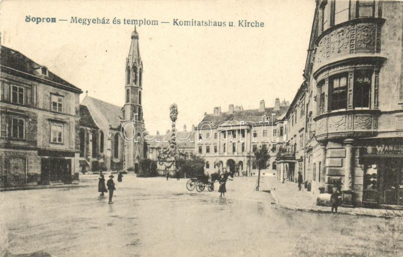 Sopron, Megyeház és templom, Wanek üzlete, kiadja Blum Náthán és fia https://www.darabanth.com/de/227-Fernauktion/227.0/Ansichtskarten/Ungarn~400006/Sopron-Megyehaz-es-templom-Wanek-uzlete-kiadja-Blum-Nathan-es-fia~II1005036