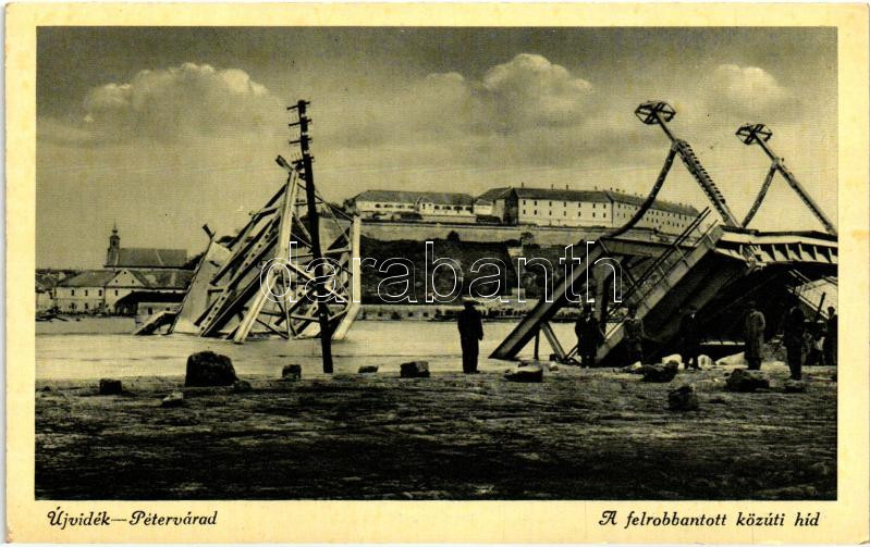 Újvidék, Pétervárad, Felrobbantott közúti híd / destroyed bridge https://www.darabanth.com/de/227-Fernauktion/227.0/Ansichtskarten/Vojvodina~400011/Ujvidek-Petervarad-Felrobbantott-kozuti-hid-destroyed-bridge~II1012434