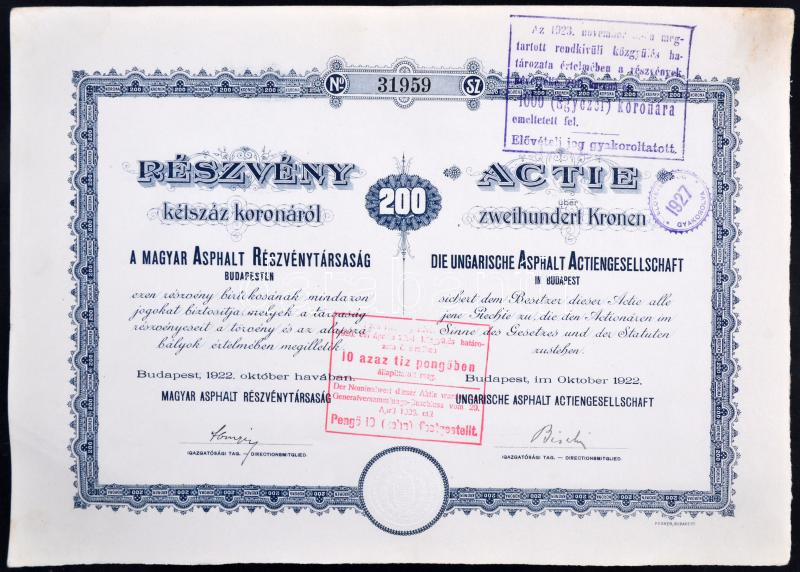 Budapest 1922. "A Magyar Asphalt Részvénytársaság" részvénye 200K-ról,... https://www.darabanth.com/de/227-Fernauktion/227.0/Numismatik/Aktien-und-Tickets~600006/Budapest-1922-A-Magyar-Asphalt-Reszvenytarsasag-reszvenye-200K-rol-szarazpecsettel-fel~II1008954