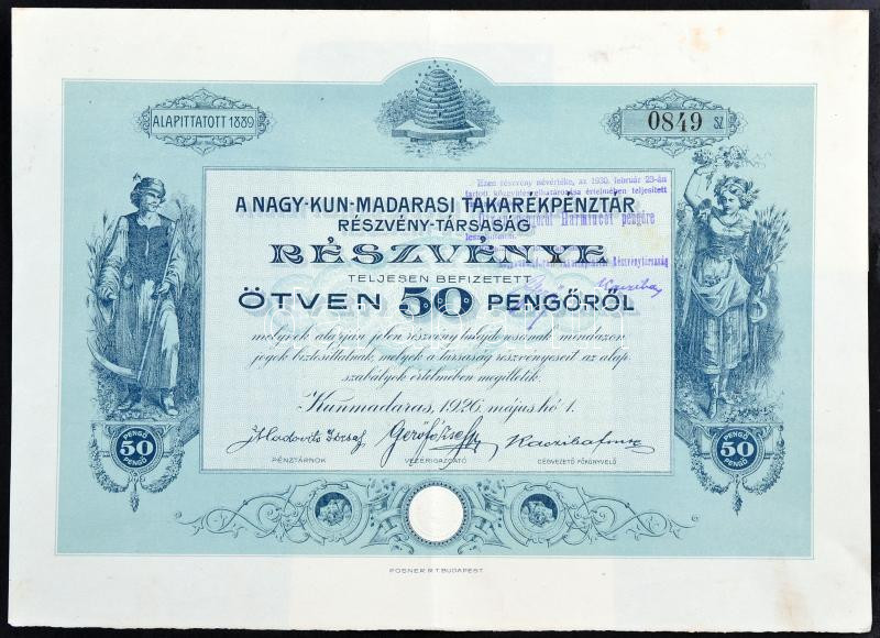 Beschreibung: Kunmadaras 1926. "A Nagy-Kun-Madarasi Takarékpénztár Részvény-Társaság" részvénye 50P-ről bélyegzésekkel T:II