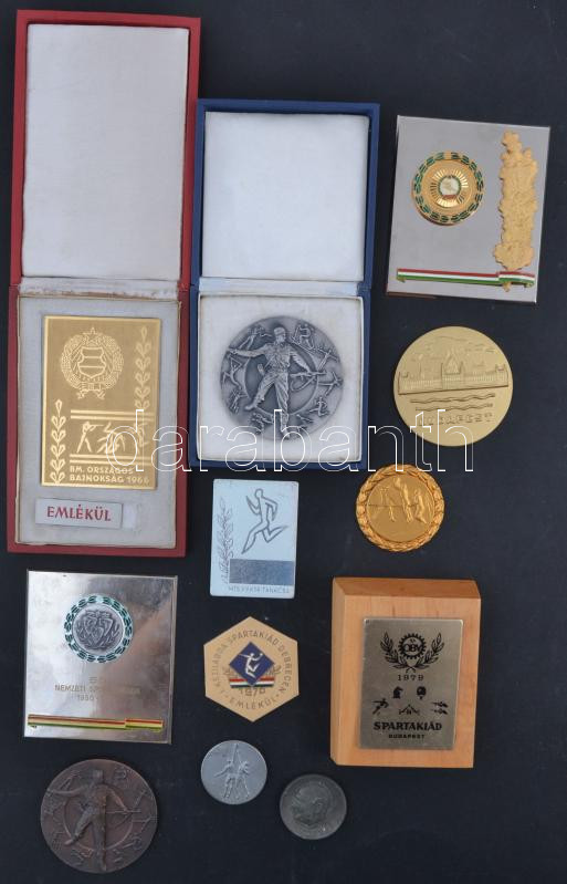 35db vegyes sportdíj és plakett főleg a Kádár-korszakból, legtöbb tokban, közte DN "Magasabb Egység Bajnokság 100m Pillangóúszás II. hely" ezüstözött fém díjérem (70mm), DN "Budapesti Honvéd S.E." zománcozott fém plakett (104x90mm), 1966. "BM. Országos Bajnokság 1966 - Emlékül" fém emlékplakett (98x67mm) T:vegyes