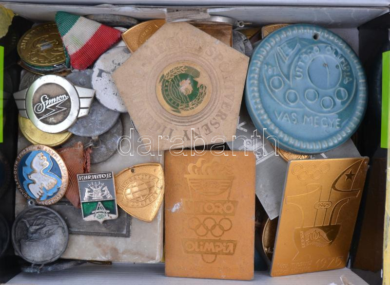 Beschreibung: ~60db vegyes magyar és külföldi jelvény, emlékérem, sportérem főleg a szocialista időszakból T:vegyes