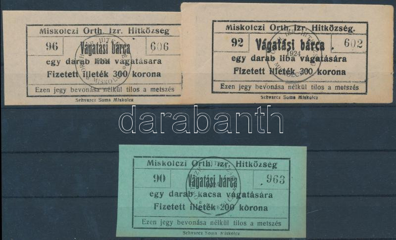 ~1925. 200K + 300K (2x) "Miskolczi Orthodox Izraelita Anyahitközösség" vágatási bárca T:I-,II