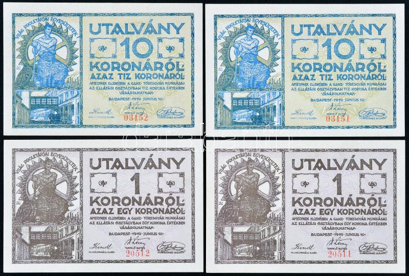 Beschreibung: Budapest 1919. "Ganz Törzsgyár" 1K utalványa (2x) sorszámkövető + 10K (2x) sorszámkövető T:I