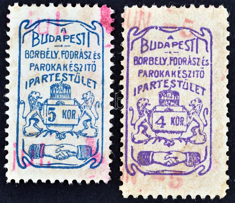Beschreibung: Budapest ~1910-1920. 4K + 5K "A Budapesti Borbély, Fodrász és Parókakészítő Ipartestület" T:I,I-