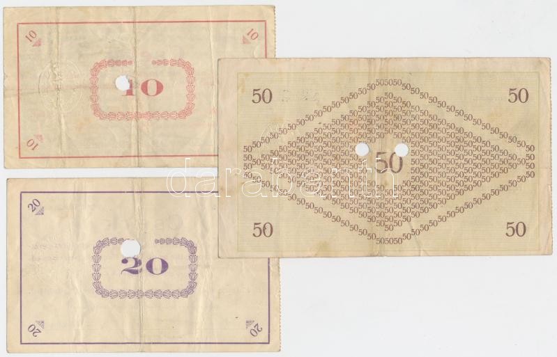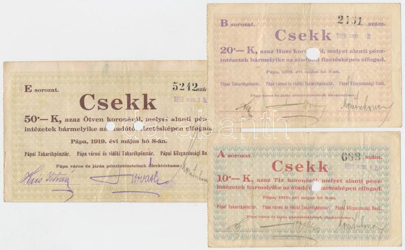 Beschreibung: Pápa 1919. május 8. "Pápai csekk" 10K + 20K + 50K mind lyukasztással érvénytelenítve és ovális szárazbélyegzővel T:III,III-