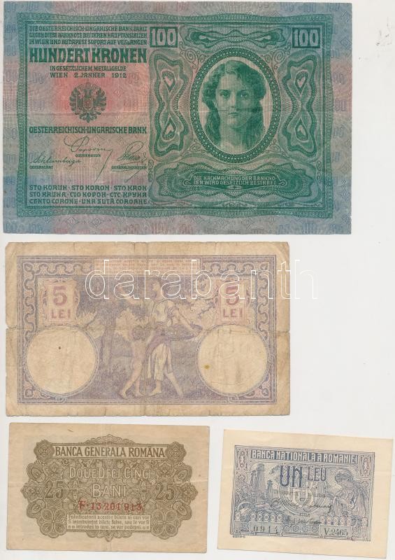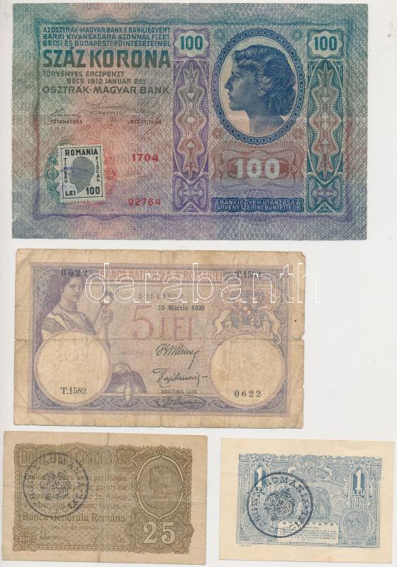 Romania 1912. 100 Corona with Romanian 100 Lei stamp + 1915. 1 Leu with Romanian overprint + German occupation 1917. 25 Bani with Romanian overprint + 1920. 5 Lei C:F,VG