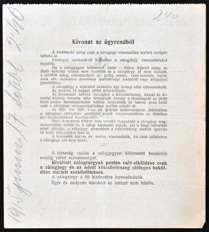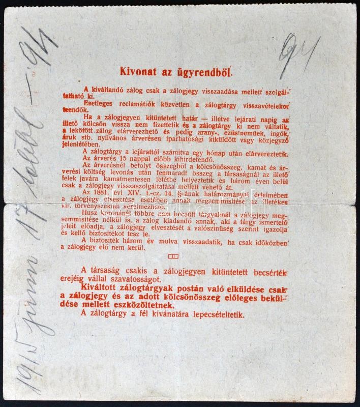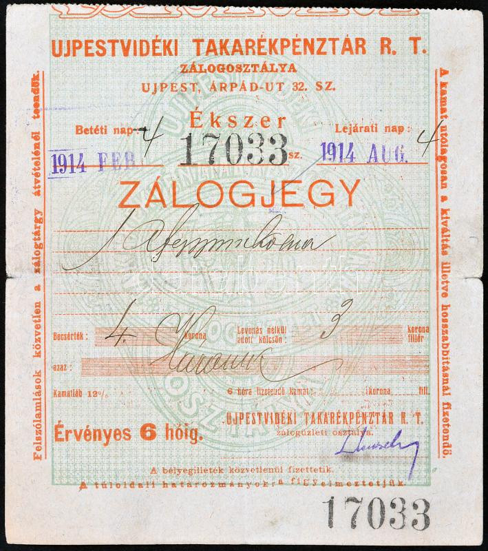 Újpest 1914. "Ujpestvidéki Takarékpénztár R.T. Zálogosztálya - Zálogje... https://www.darabanth.com/de/227-Fernauktion/227.0/Numismatik/Notgelden~600007/Ujpest-1914-Ujpestvideki-Takarekpenztar-RT-Zalogosztalya--Zalogjegy-2xklf-TIII~II1012056