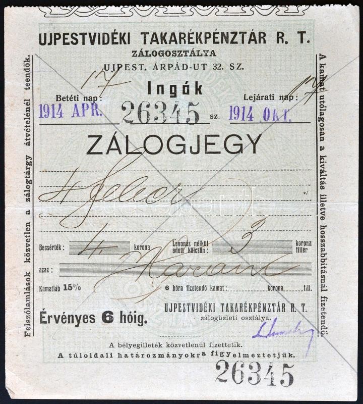 Beschreibung: Újpest 1914. "Ujpestvidéki Takarékpénztár R.T. Zálogosztálya - Zálogjegy" (2xklf) T:III