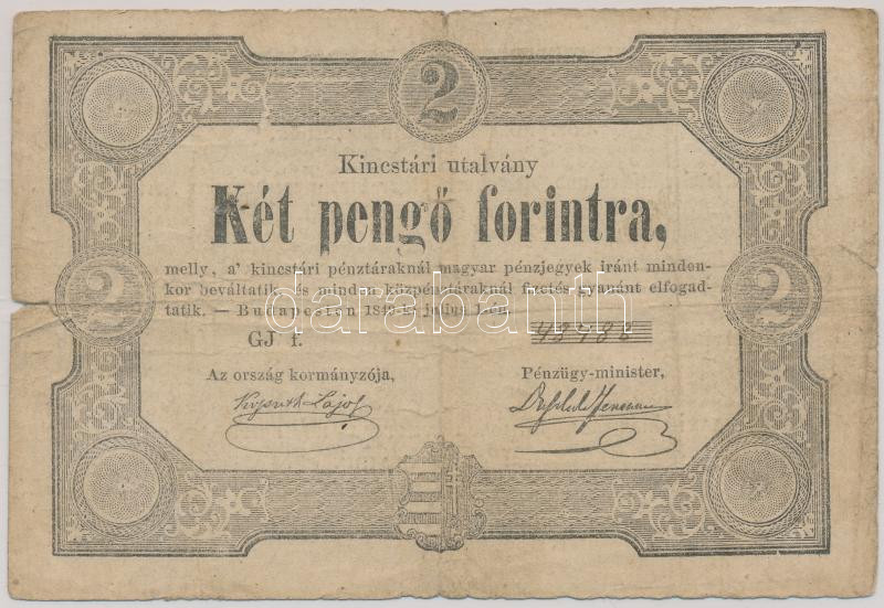 1849. 2Ft "Kincstári utalvány" T:III- https://www.darabanth.com/de/227-Fernauktion/227.0/Numismatik/Ungarische-Banknoten~600008/1849-2Ft-Kincstari-utalvany-TIII-~II1003424