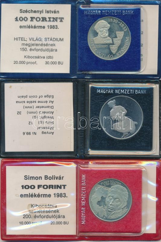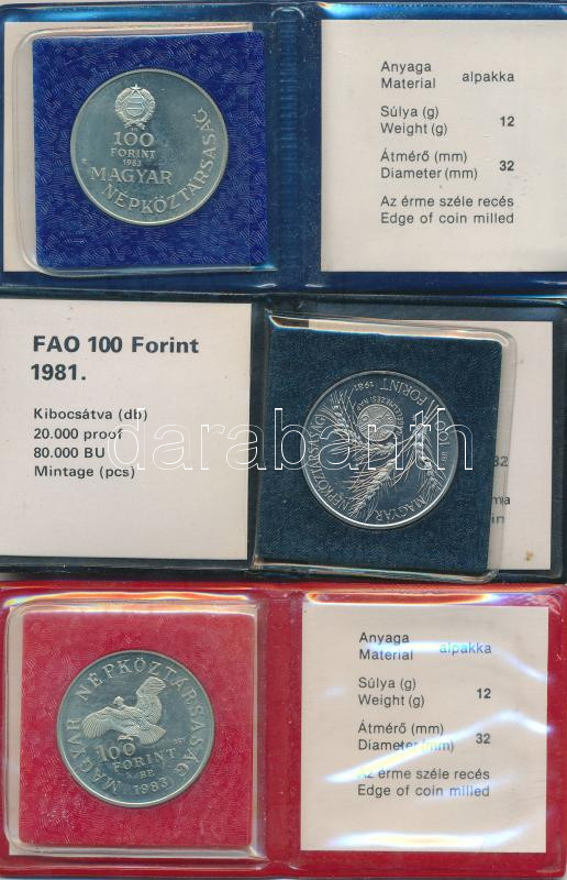 Beschreibung: 1981. 100Ft Ni "FAO" + 1983. 100Ft alpakka "Széchenyi István" + 1984. 100Ft alpakka "Kőrösi Csoma Sándor", mindhárom eredeti tokban, tanúsítvánnyal T:PP