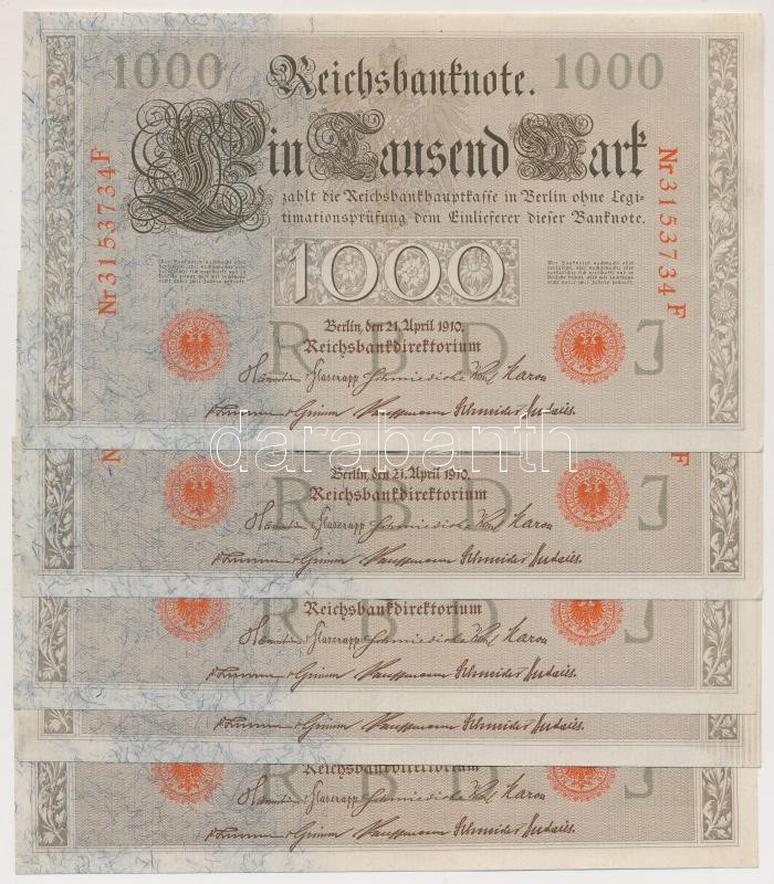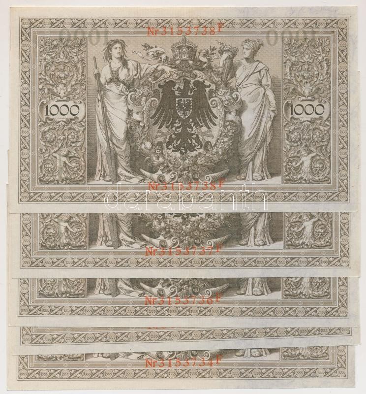 German Empire 1910. 1000 Mark (5x) 7 digits and red seal, sequential serials C:VF,F