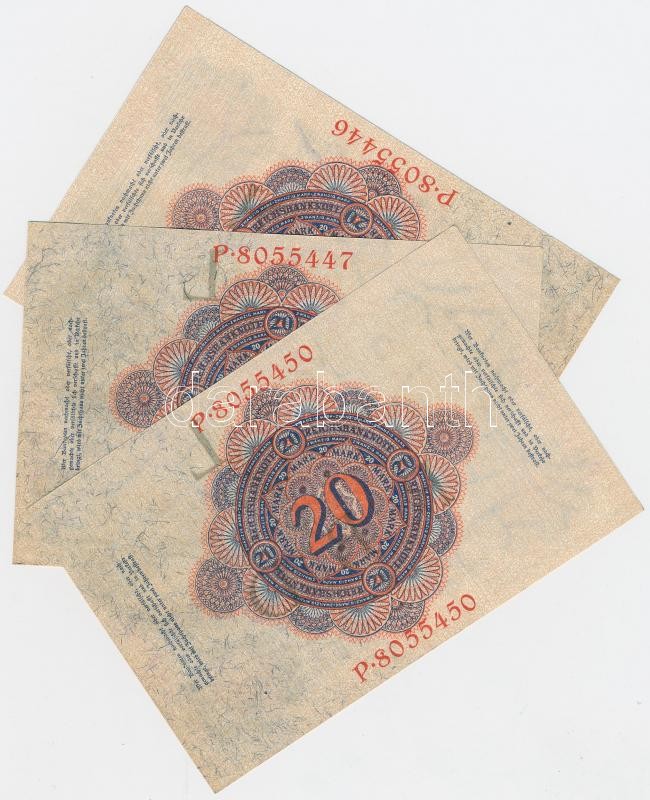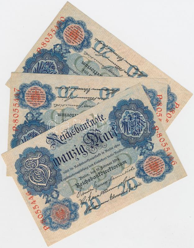 Német Birodalom / Császárság 1914. 20M hétjegyű sorszám (3x) kettő sorszámkövető T:I,I-
