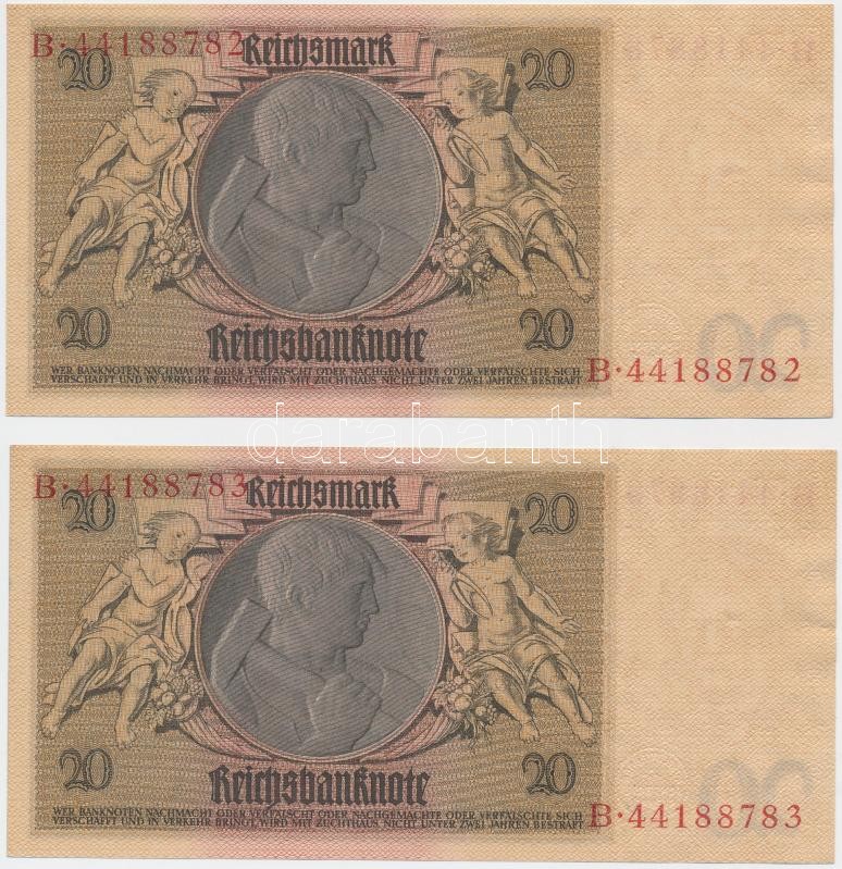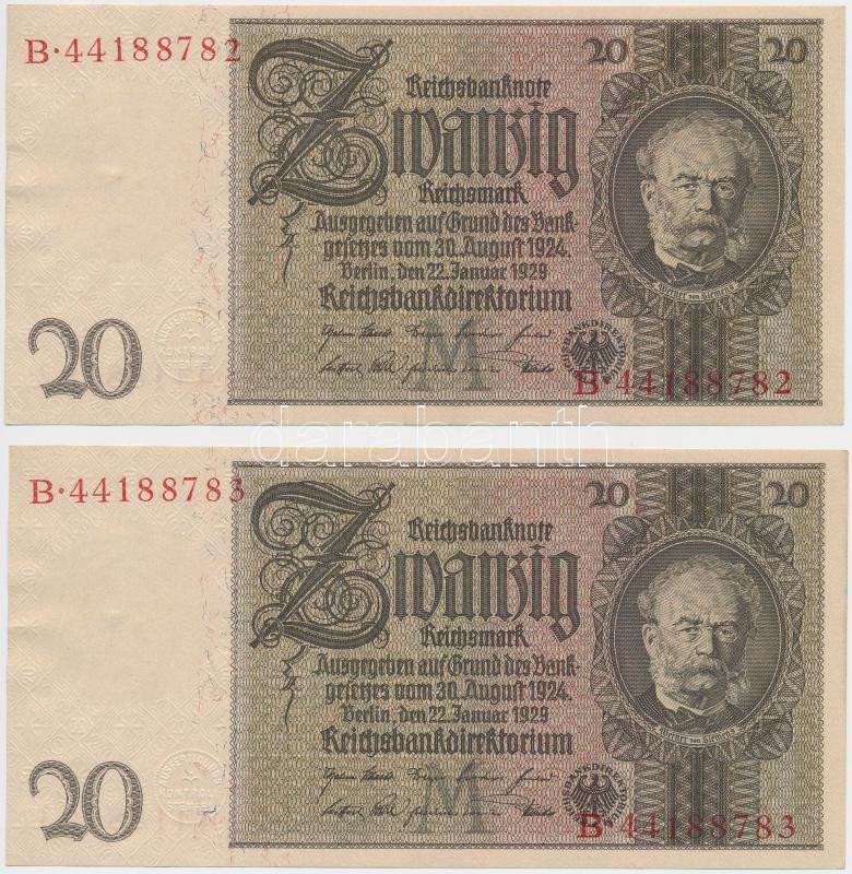 Germany / Weimar Republic 1929. 20 Mark (2x) sequential serials C:UNC tiny folded corner