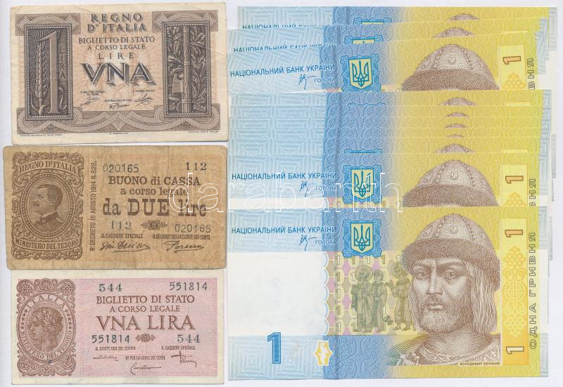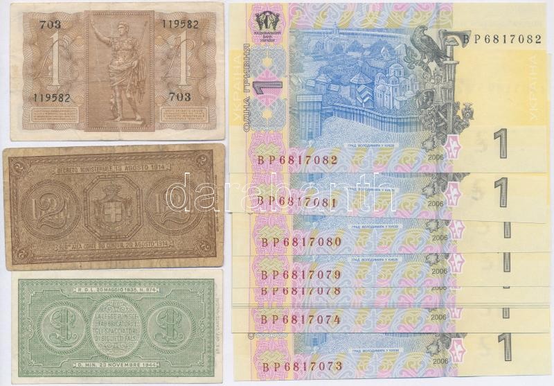 Italy 1914. 2 Lire + 1935. 1 Lira + 1944. 1 Lira + Ukraine 2006. 1 Hryvnia (10x) sequential serials C:UNC,F,VG