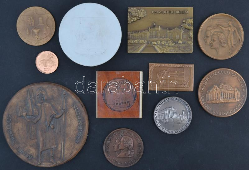 11db külföldi emlékérem és plakett, városok, egyetemek és intézmények témákban, legtöbb tokban, közte Németország 1967-1969. "Humboldt Egyetem Berlin / Wilhelm és Alexander von Humboldt 200. születésnapjára 1967-1969" Br emlékérem tokban (63mm), Ausztria DN "Az Osztrák Köztársaság Nemzeti Tanácsa és Szövetségi Tanácsa" ezüstözött Br emlékérem, tokban. Szign.:A. Zierler (60mm) T:vegyes