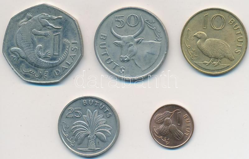 Gambia 1971-1987. 1 Butut Br + 10 Bututs Ni-Brass + 25 Bututs Cu-Ni + 50 Bututs Cu-Ni + 1 Dalasi Cu-Ni C:XF,VF