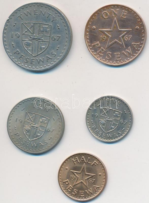 Beschreibung: Ghána 1967. 1/2p Br + 1p Br + 5p Cu-Ni + 10p Cu-Ni + 20p Cu-Ni T:2-